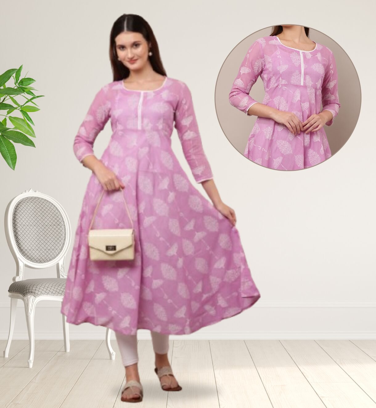 • Block Printed Artistry: The Block Printed Cotton Anarkali for Women features intricate block-printed patterns, a traditional Indian technique that showcases meticulous craftsmanship. The prints add a vibrant yet elegant touch, making this Anarkali a standout piece.