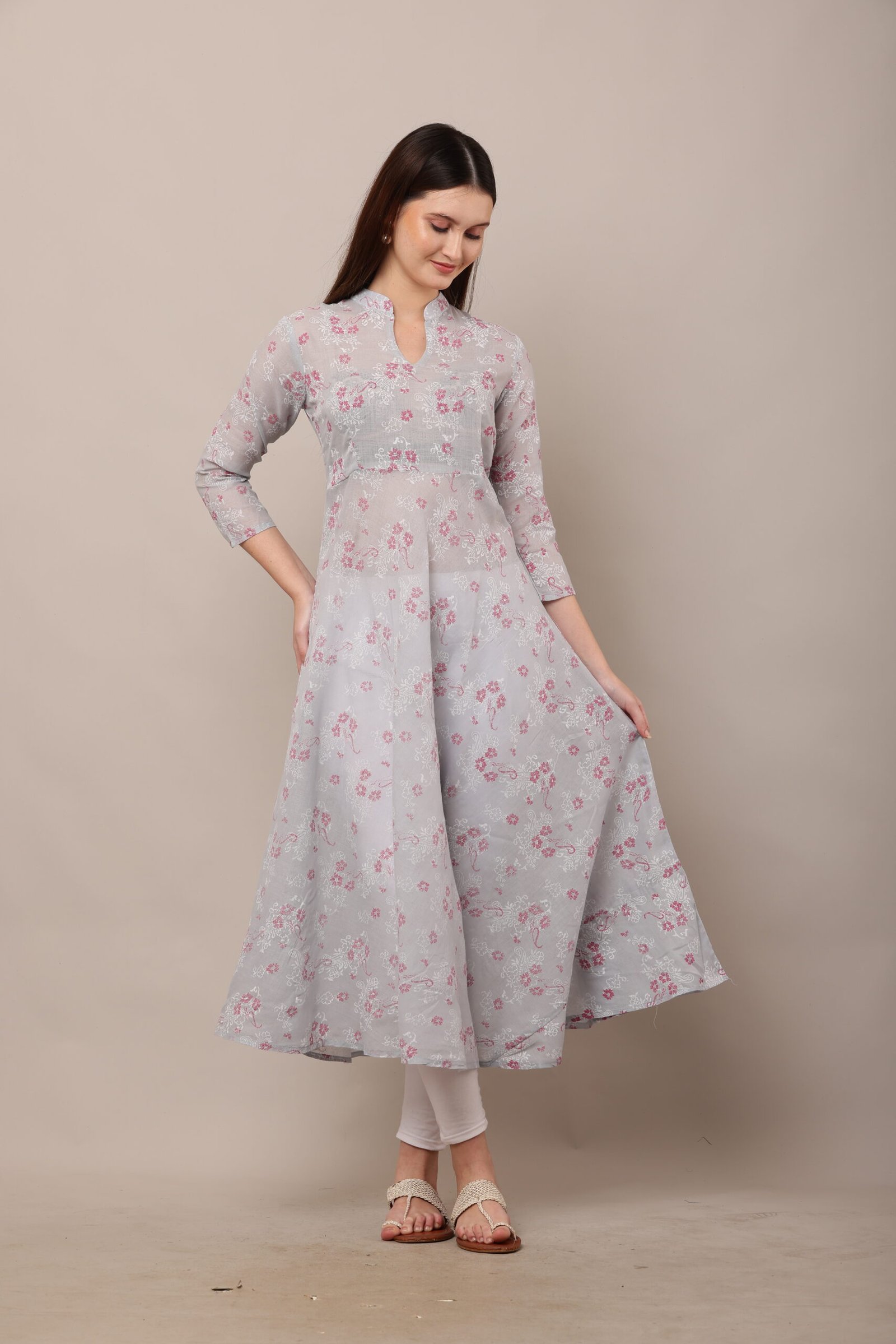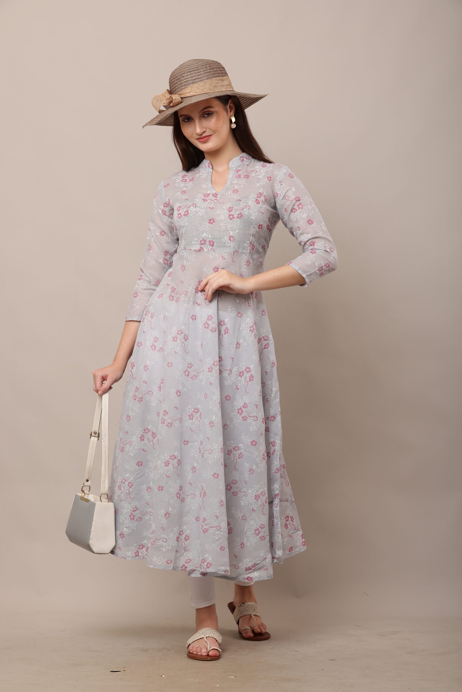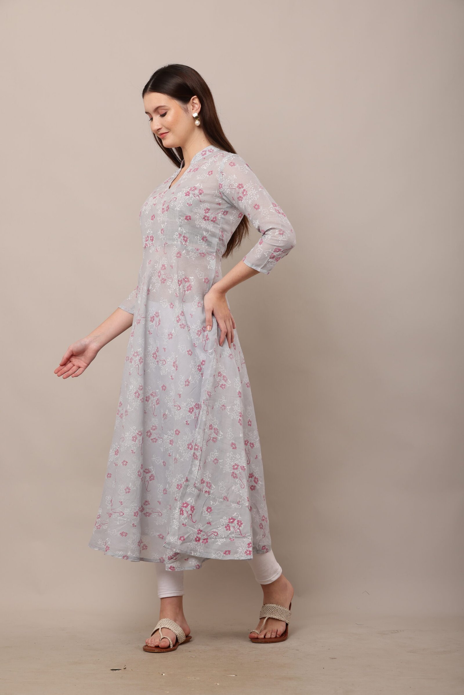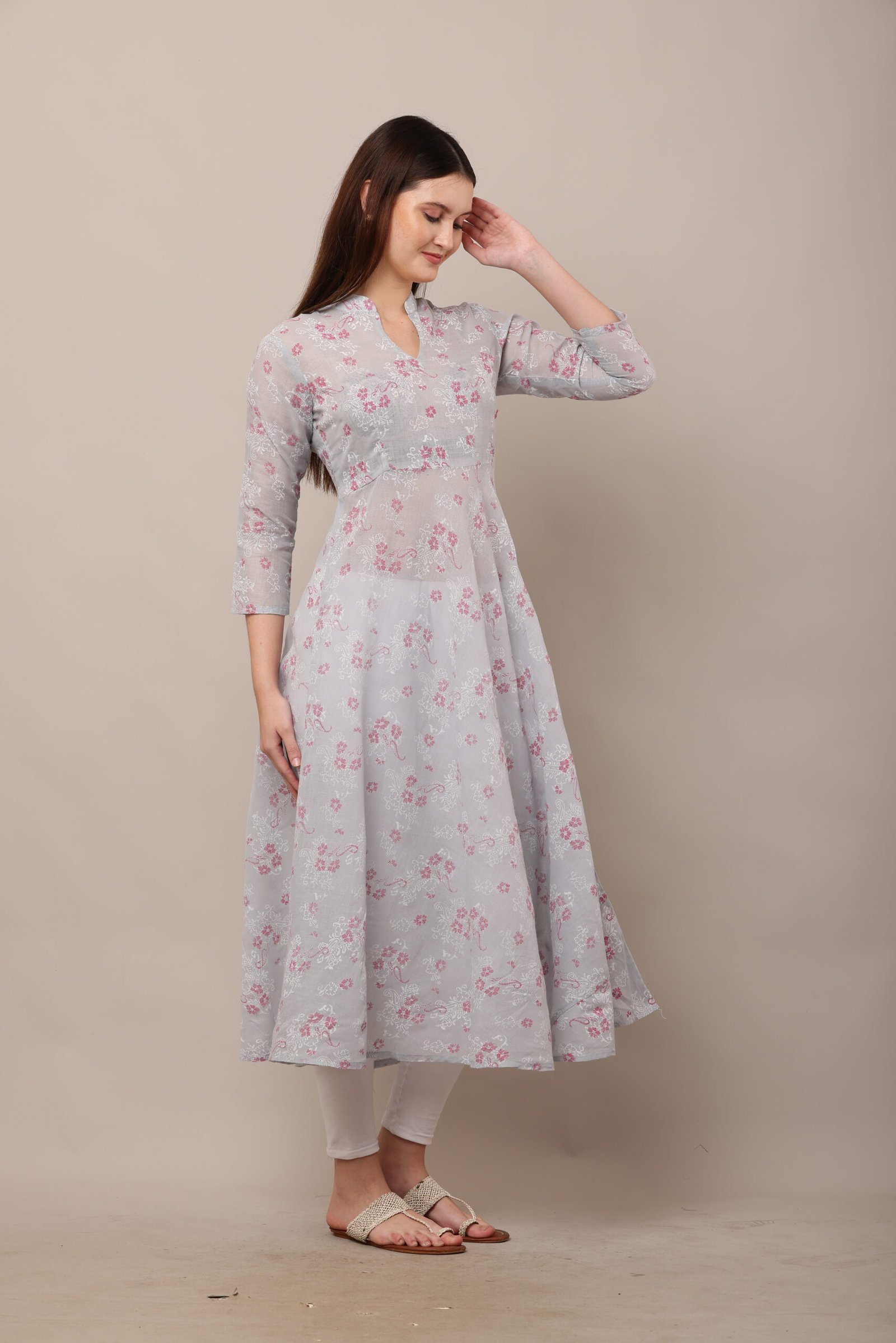 - The PSG-A37 Block Printed Cotton Anarkali features a captivating block-printed design, a traditional Indian art form that showcases intricate patterns created by skilled artisans. The block prints are meticulously crafted, adding a touch of cultural heritage to the dress. The 3/4 sleeves lend a sophisticated yet practical touch, making the dress suitable for both warm and cooler weather.